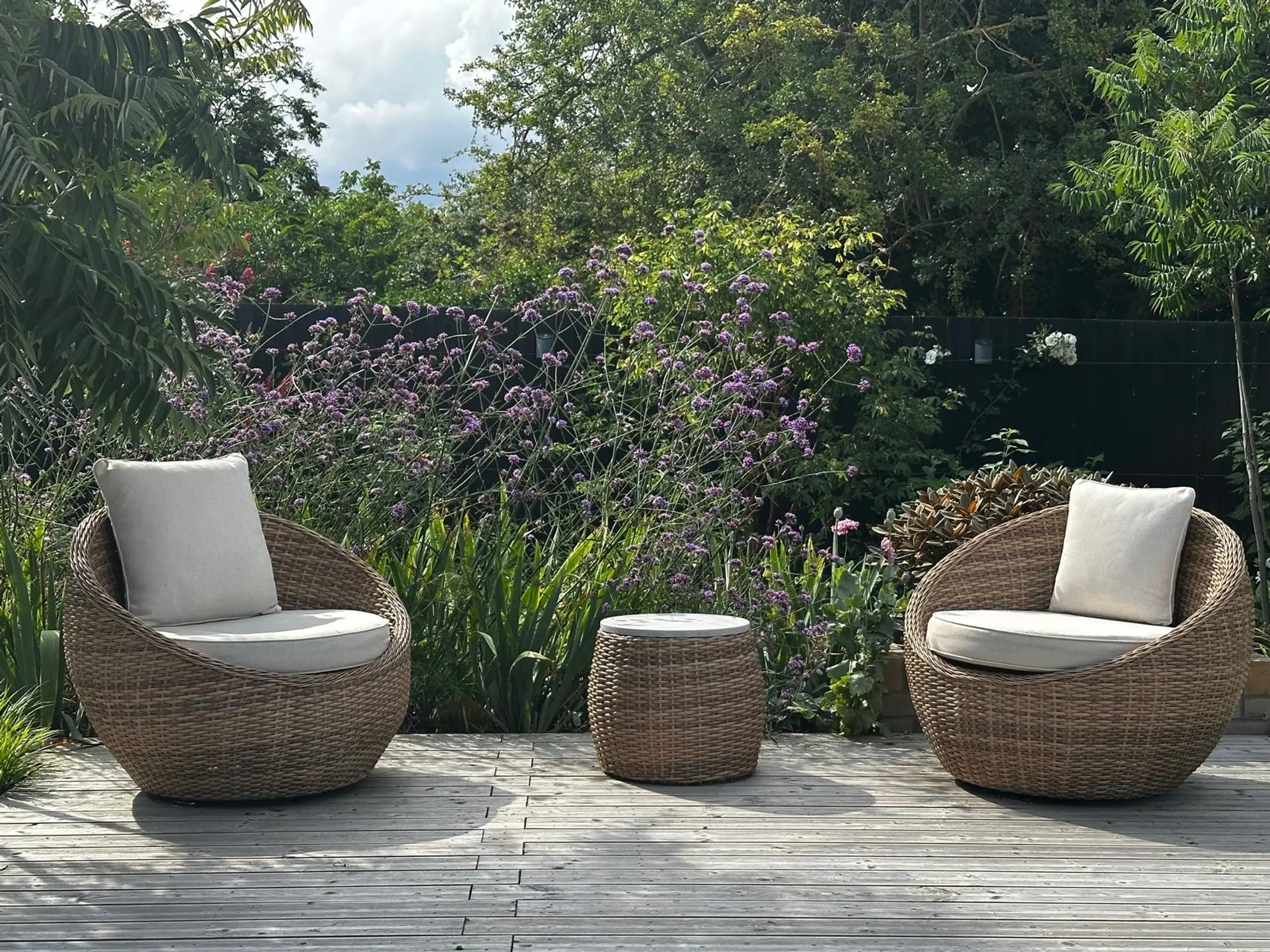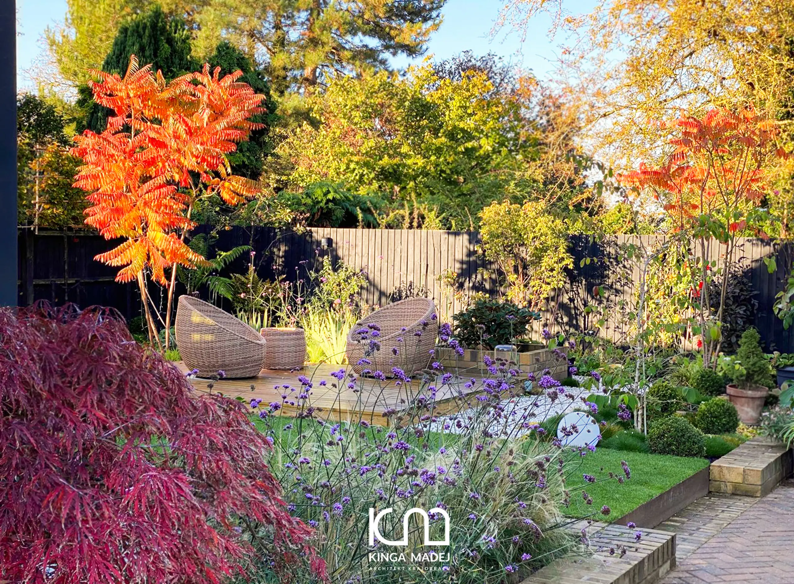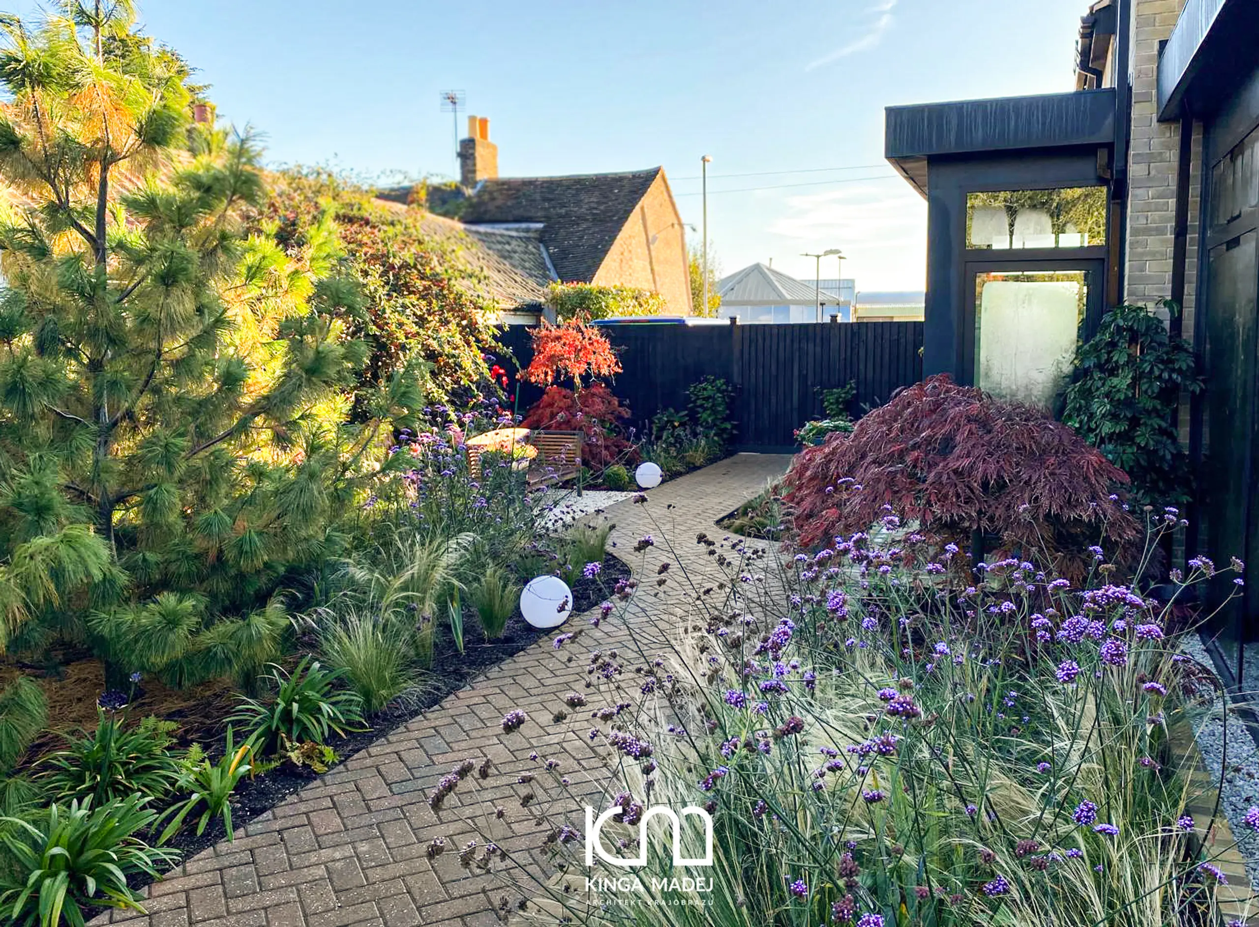 Istniejące drewniane ogrodzenie zostało pomalowane na czarno, dzięki czemu stało się doskonałym, neutralnym tłem dla zieleni i sezonowo zmieniających się barw roślin.