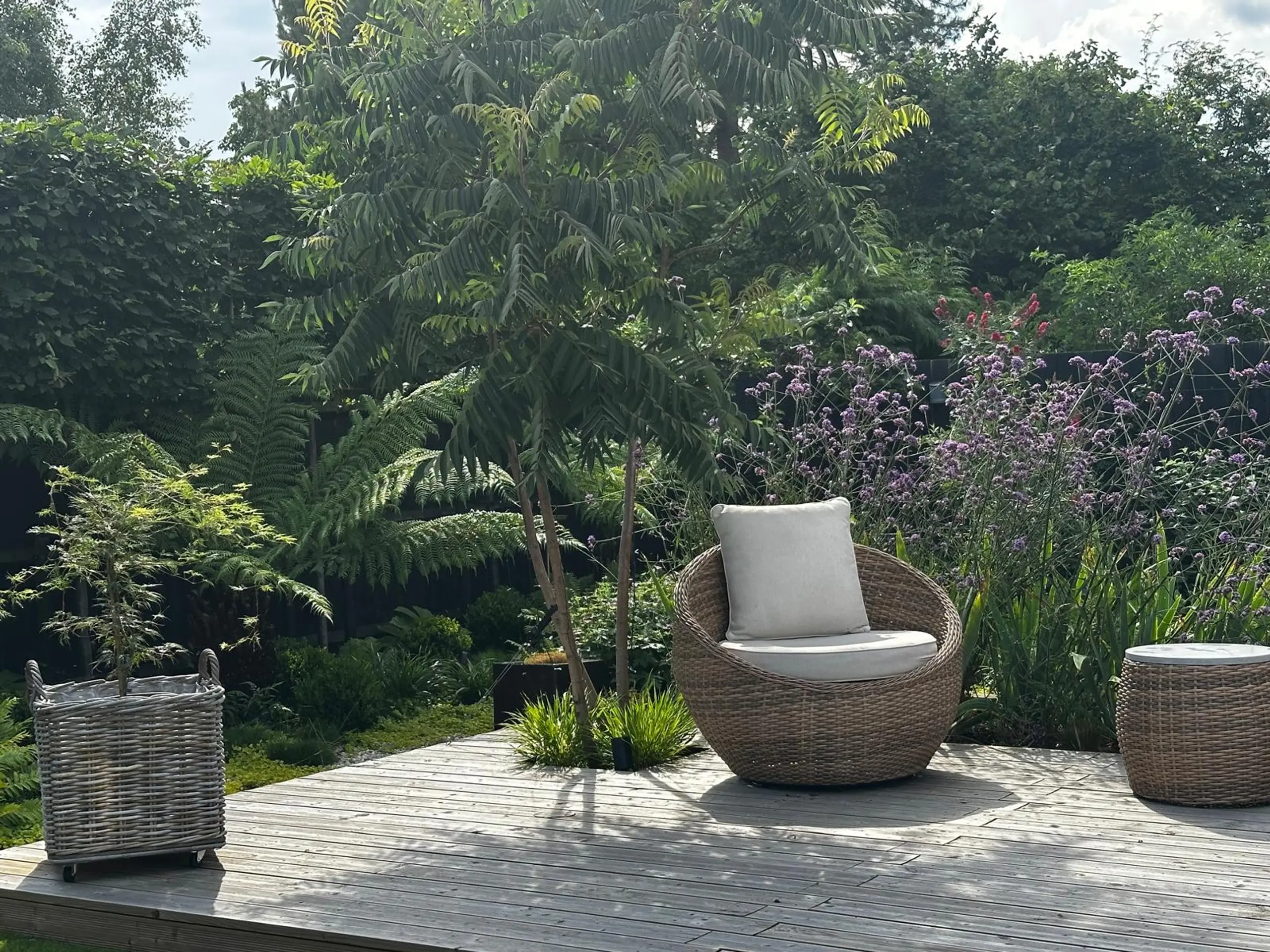 Cegła rozbiórkowa została wykorzystana konsekwentnie w całym założeniu, powstały z niej wyniesione donice, które miękko otulają tarasy i porządkują przestrzeń. W ogrodzie znalazł się również niewielki, strzyżony trawnik, który otwiera widok na główny taras z drewna, uzupełniony o wnękę z wielopiennym sumakiem jako mocnym akcentem kompozycyjnym.