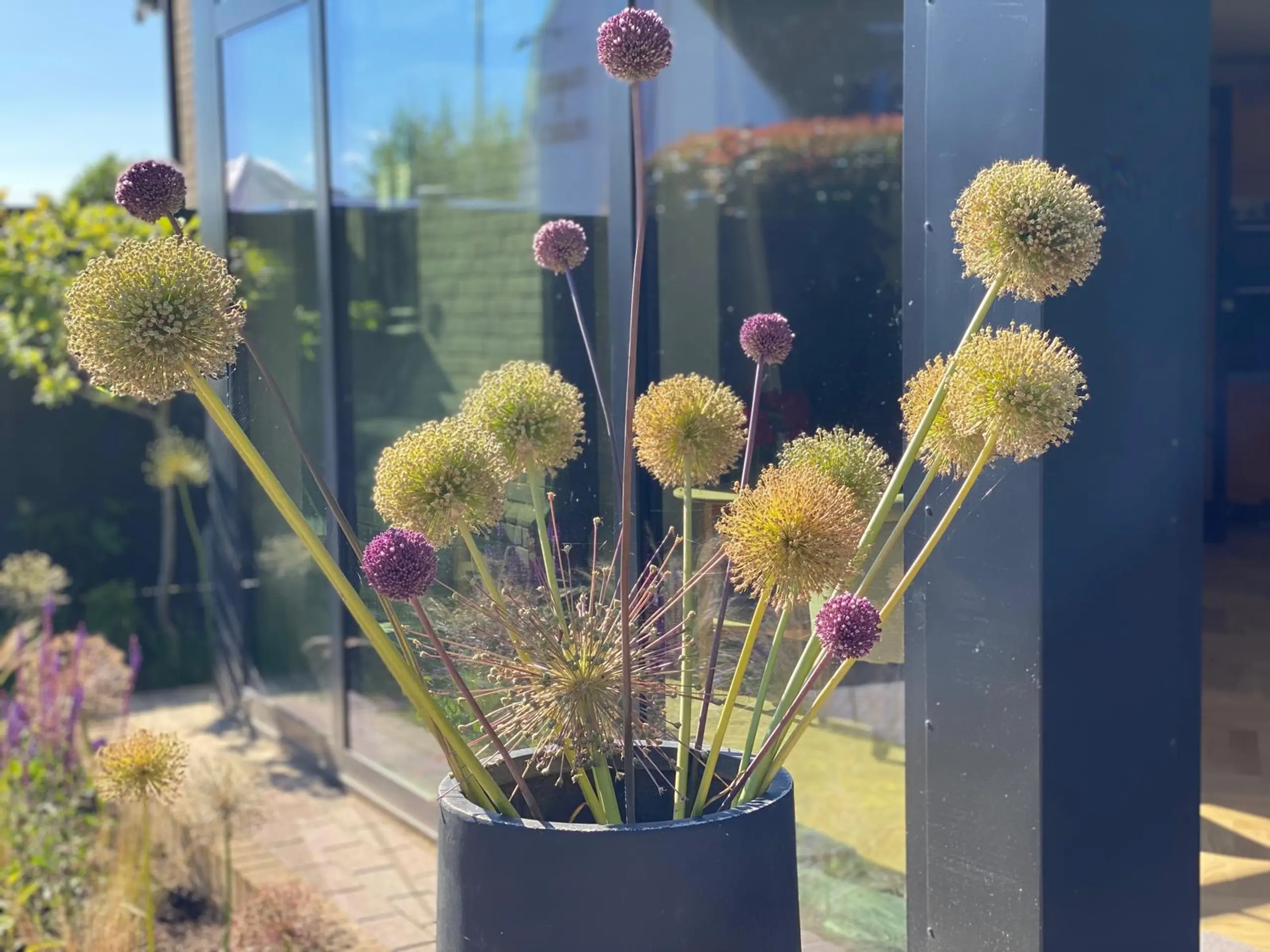Do ogrodu z parkingu prowadzi kręta ścieżka z cegły rozbiórkowej, pozyskanej z częściowo zlikwidowanego podjazdu. To rozwiązanie podkreśla ideę ponownego wykorzystania materiałów. Główny widok na ogród wychodzi z przeszklonej oranżerii (ogrodu zimowego), który płynnie łączy wnętrze domu z zielenią. Roślinność jest bujna i zróżnicowana, tworząc wrażenie dojrzałego, żywego ogrodu. Pani Inwestor co roku wzbogaca rabaty o dodatkowe nasadzenia, między innymi różnokolorowe dalie, dzięki czemu ogród nieustannie się zmienia i ewoluuje.