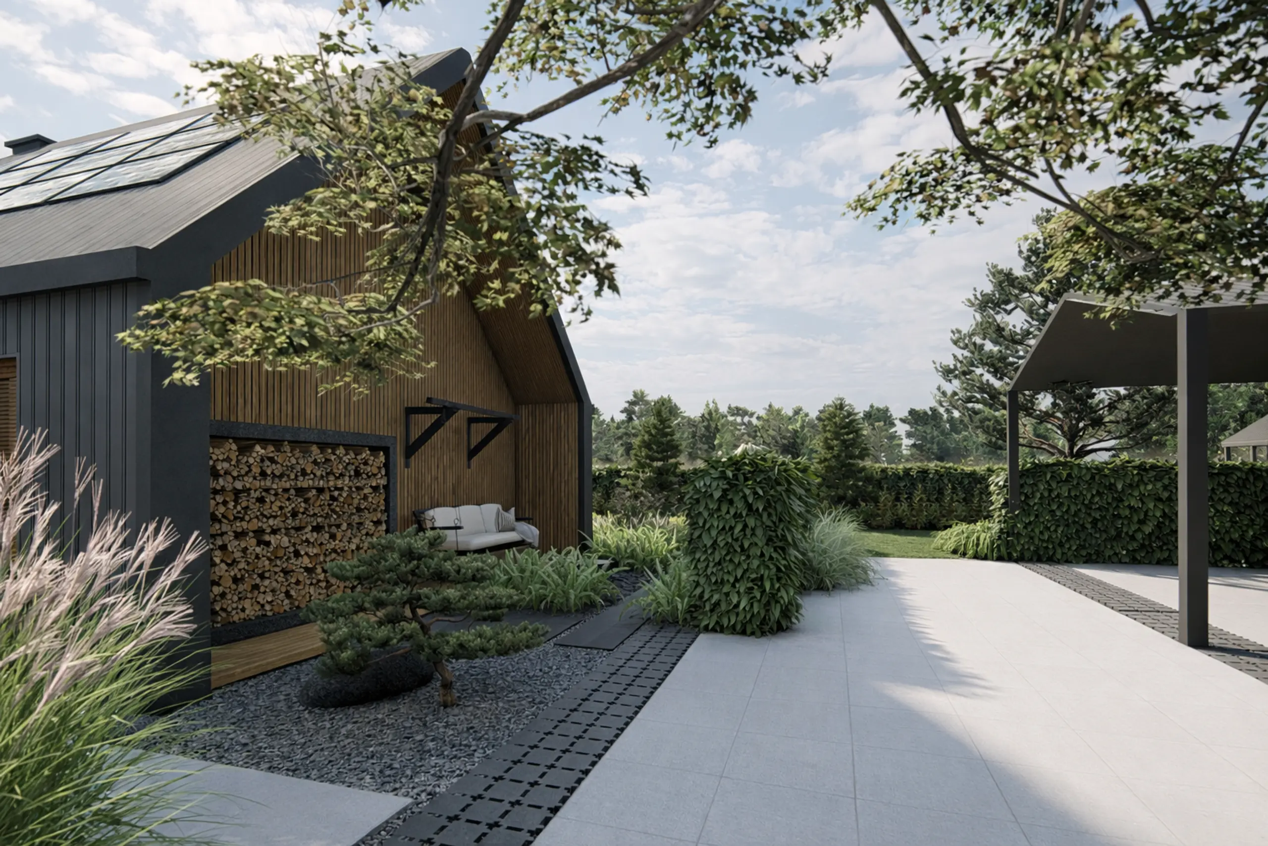 - Dostosowanie ogrodu do bryły budynku (nowoczesna stodoła)