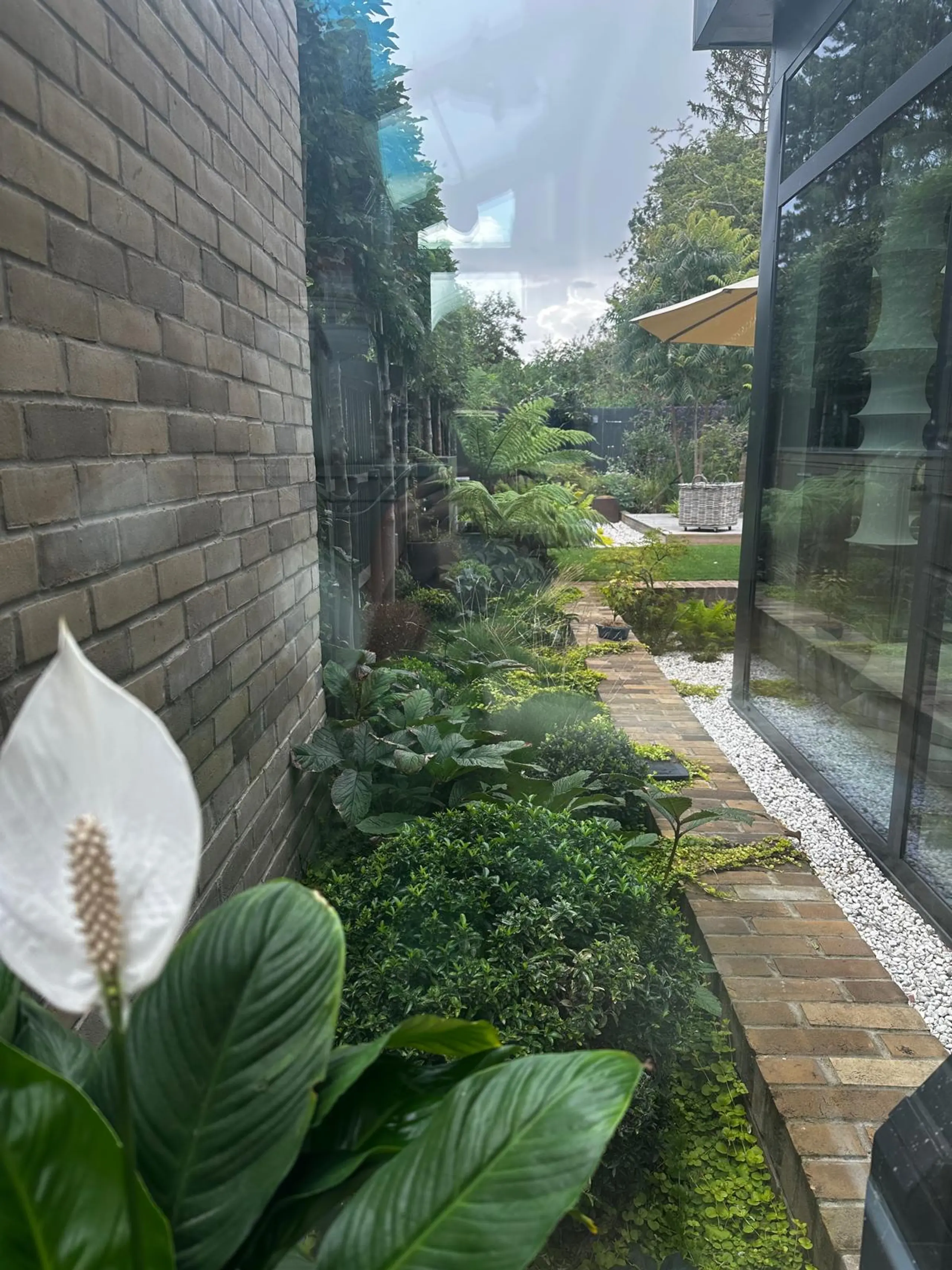 Do ogrodu z parkingu prowadzi kręta ścieżka z cegły rozbiórkowej, pozyskanej z częściowo zlikwidowanego podjazdu. To rozwiązanie podkreśla ideę ponownego wykorzystania materiałów. Główny widok na ogród wychodzi z przeszklonej oranżerii (ogrodu zimowego), który płynnie łączy wnętrze domu z zielenią. Roślinność jest bujna i zróżnicowana, tworząc wrażenie dojrzałego, żywego ogrodu. Pani Inwestor co roku wzbogaca rabaty o dodatkowe nasadzenia, między innymi różnokolorowe dalie, dzięki czemu ogród nieustannie się zmienia i ewoluuje.