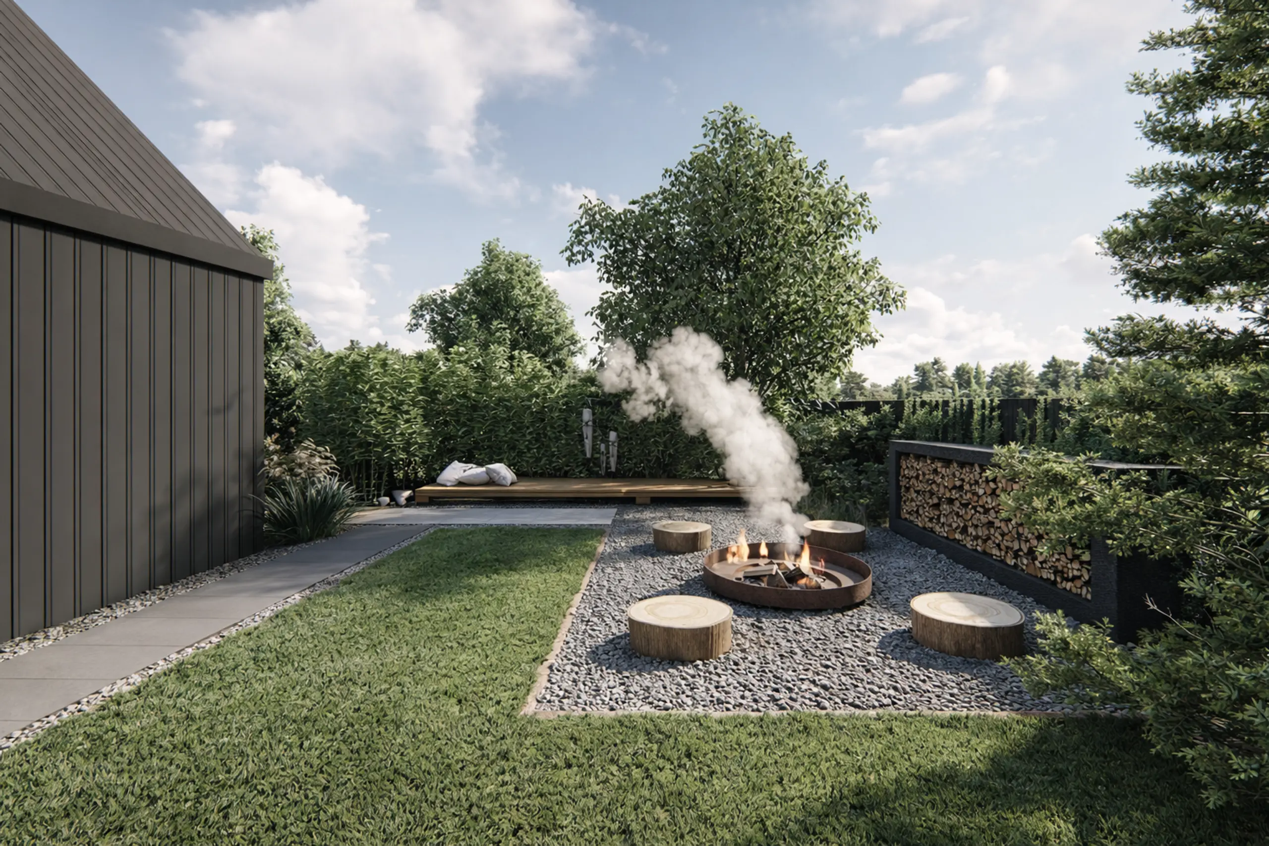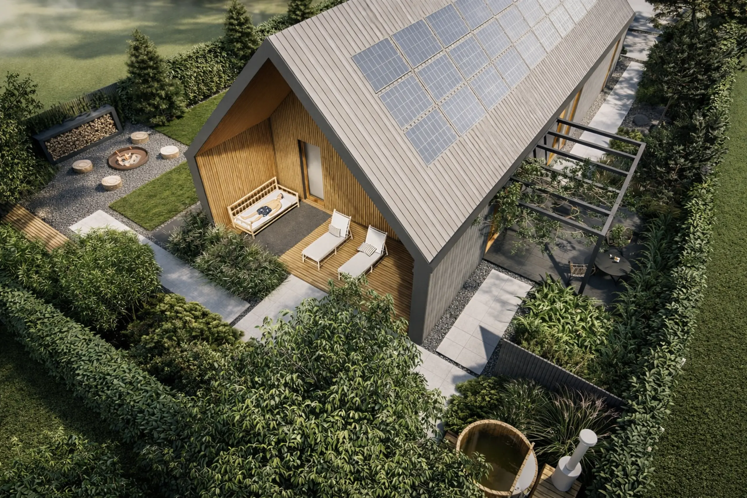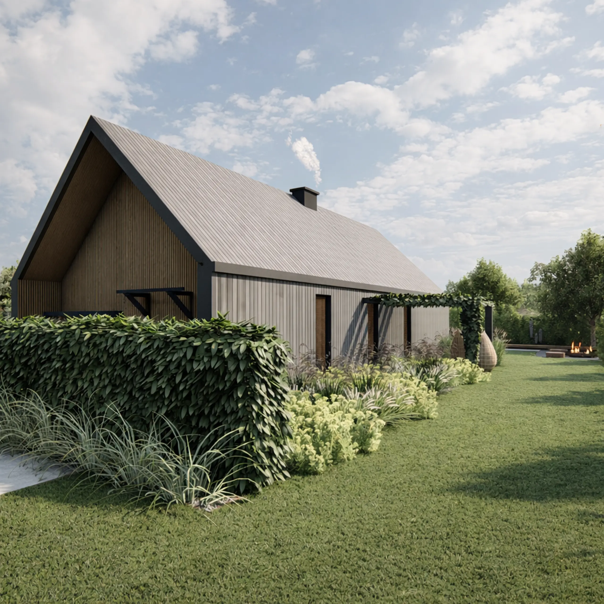 Opracowałam koncepcję ogrodu inspirowanego stylem skandynawskim, przy nowoczesnej stodole. Z założenia jest to dom na długoterminowy wynajem, dlatego rozwiązania funkcjonalne przestrzeni musiały być uniwersalne, dopasowane do każdej grupy wiekowej.