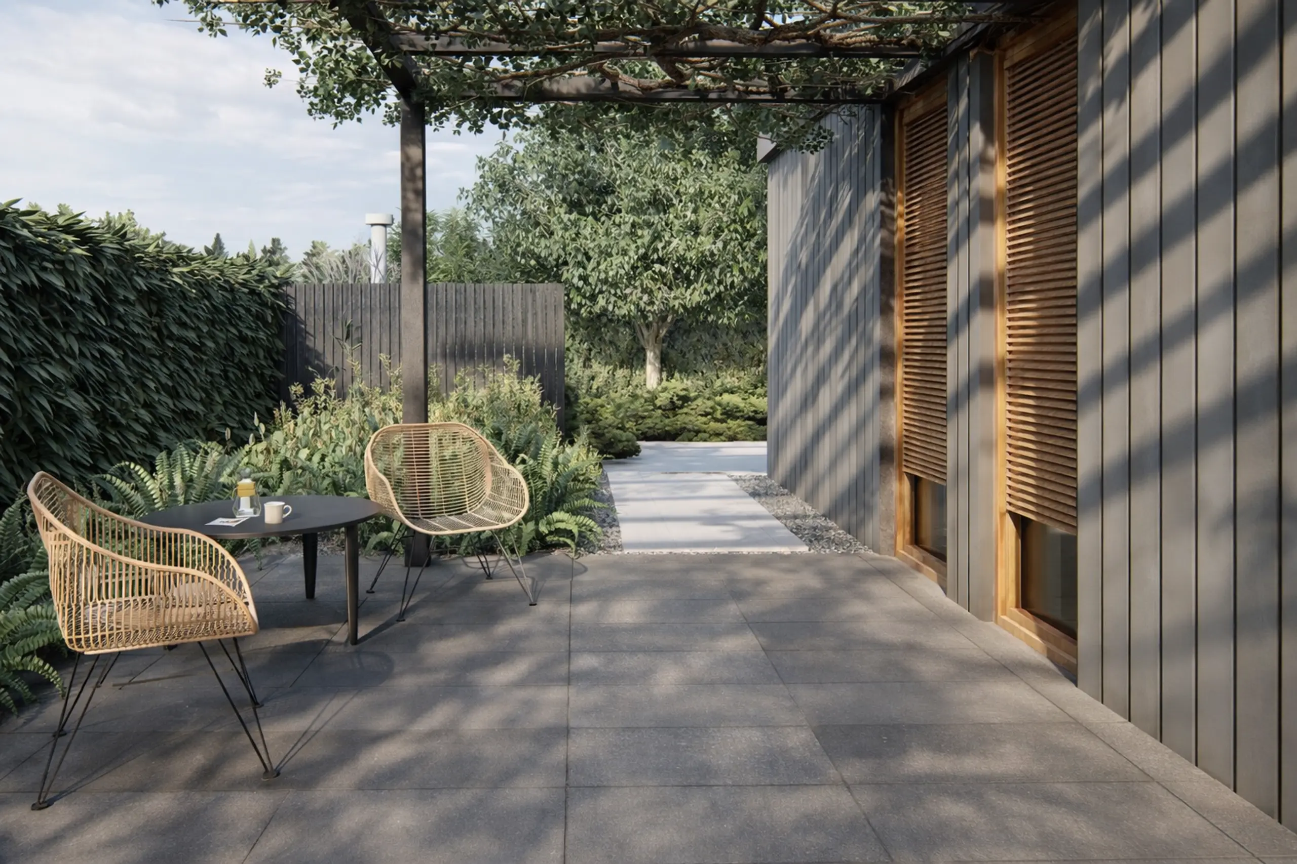 Tarasy wypoczynkowe i prowadzące do nich ścieżki zaprojektowane zostały z połyskujących płyt Semmelrock Lunis Largo, kolor Luce Nero. Ogrodzenie frontowe powstanie z betonu architektonicznego Semmelrock Parretii i antracytowych przęseł żaluzjowych.