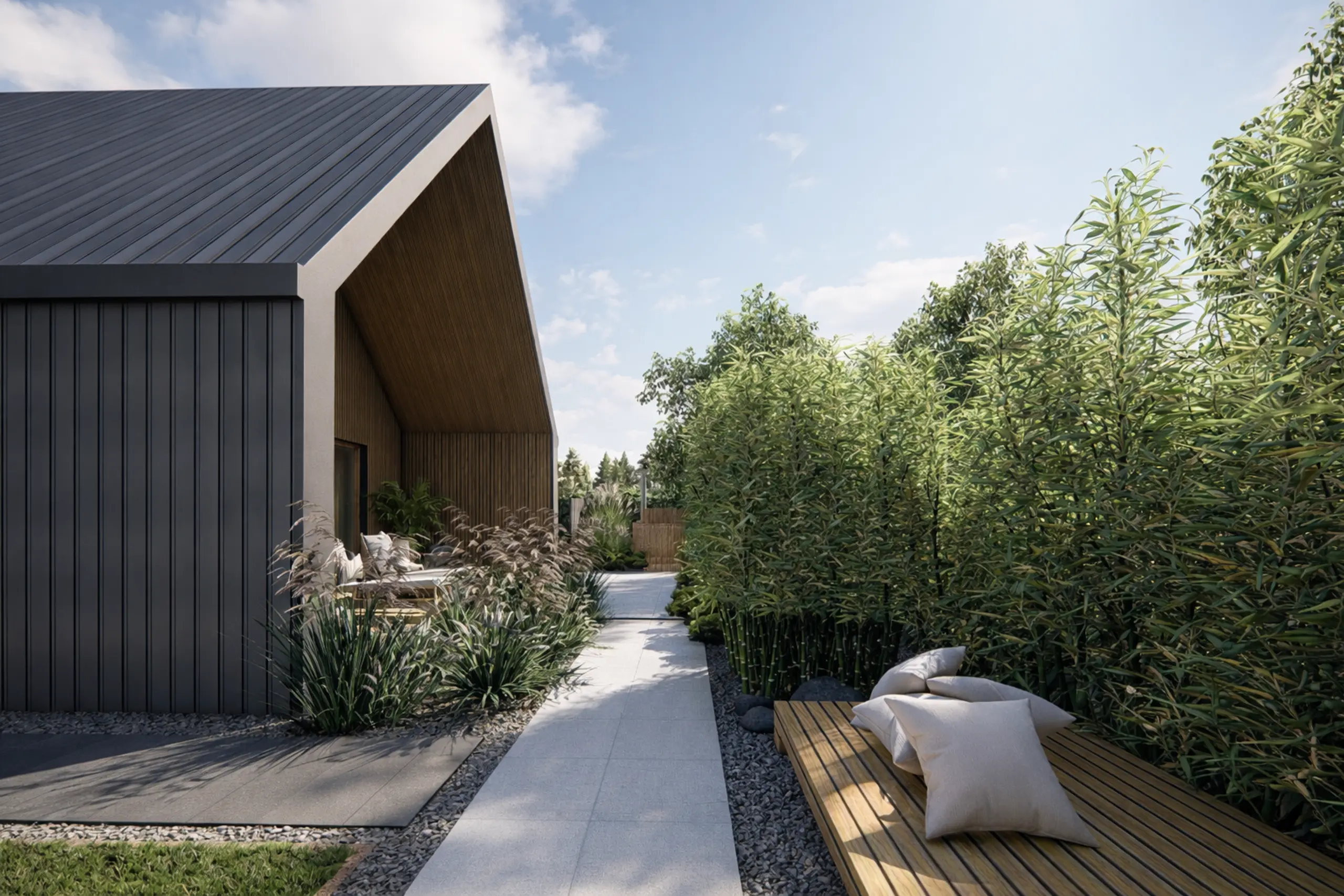 - Dostosowanie ogrodu do bryły budynku (nowoczesna stodoła)